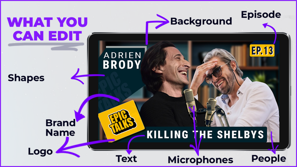 We researched the top performing thumbnail design strategies in the podcast niche. So be sure to increase your viewership with these templates.